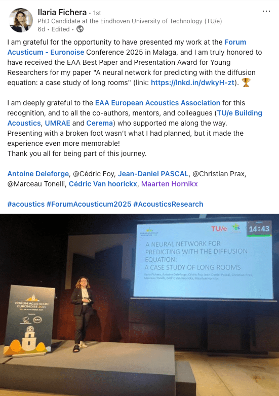 During the closing ceremony of Forum Acusticum Euronoise 2025 in Malaga, Ilaria Fichera has received the EAA Best Paper and Presentation Award for Young Researchers for her paper “A neural network for predicting with the diffusion equation: a case study of long rooms”, congratulations to Ilaria!